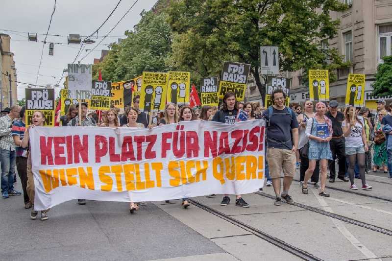 Die Demonstration zieht über die Fuhrmannsgasse 18, einem rechtsradikalen Treffpunkt, wo die Identitären ihre erste Pressekonferenz abhielten, zur FPÖ-Zentrale. „Der Fisch stinkt vom Kopf her. Die Freiheitlichen werden von rechtsradikalen Burschenschaftern geführt, die sich nie aus den Traditionen des Nationalsozialismus gelöst haben. Man muss die FPÖ samt ihren identitären Kameraden mit nassen Fetzen aus der Regierung und dem Parlament jagen!“