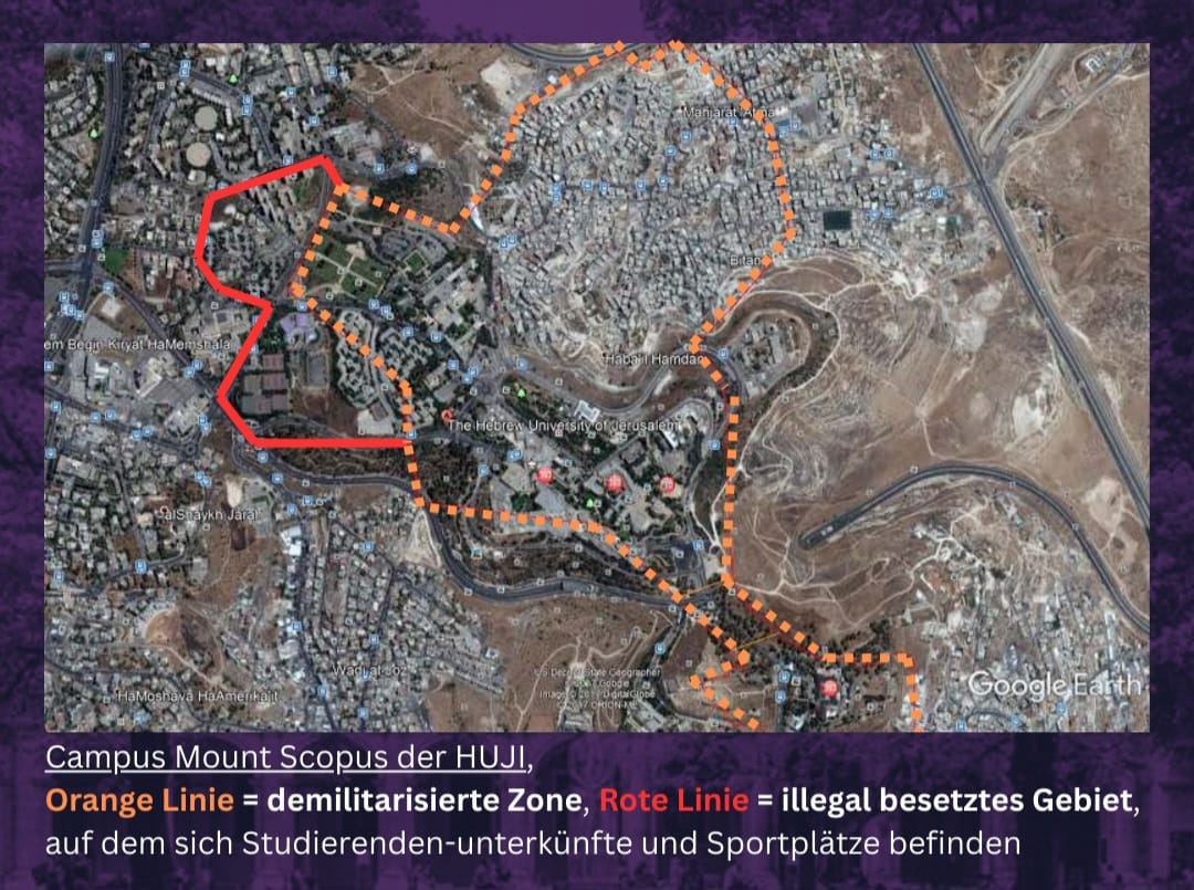 Die israelischen Universitäten haben eine Grundpfeiler- und Vorkämpferrolle im zionistischen Siedlerkolonialismus, der aktuell im Völkermord an den Palästinenser:innen in Gaza kulminiert. Die Hebrew University, ist durch ihre engen Verbindungen zum militärischen Apparat strukturell in Menschenrechtsverletzungen und den Bruch von internationalem Recht involviert. Die physische Präsenz des Mount Scopus Campus in illegal besetztem Gebiet, normalisiert die Besatzung, an der die Hebrew University durch die 1968 enteigneten Gebiete, direkt mitwirkt. Darüber hinaus beteiligt sich die Universität aktiv an der staatlichen Unterdrückung der palästinensischen Nachbarschaft Al-Issawiyeh. Durch die Austauschprogramme werden auch österreichische Studierende zum Leben und Lernen in illegal besetztem Gebiet entsandt. Somit macht sich die Universität durch ihre „Strategische Partnerschaft“ zur Komplizin im Genozid und in der Aufrechterhaltung der Besatzung.  Aus diesem Grund fordern wir Studierende den sofortigen und endgültigen Abbruch aller wissenschaftlichen Beziehungen zwischen der Universität Wien und der HUJI.
