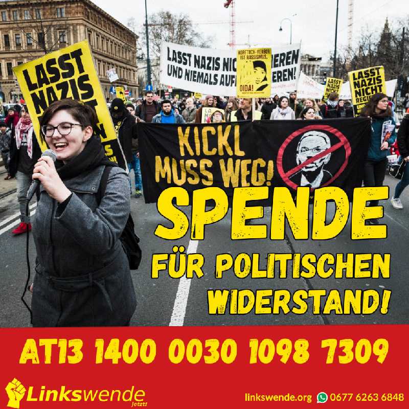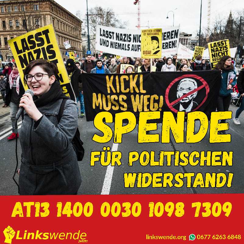 Politische Arbeit kostet Geld. Mit deiner Spende leistest du einen wichtigen Beitrag für den Aufbau der kommenden Proteste gegen die FPÖ, Rassismus, Klimawandel, Demokratie- und Sozialabbau. Dein Geld ist bei uns besser investiert als bei jeder Bank!