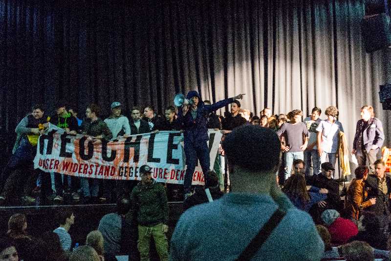 28 Jahre später stürmt wieder eine Truppe von Neonazis eine Theateraufführung – Elfriede Jelineks „Die Schutzbefohlenen“ im Audimax der Universität Wien. Dieses Mal sind es die „Identitären“, eine Gruppierung gewaltbereiter Neonazis, die zuletzt in Graz einen brutalen Überfall auf Antifaschist_innen verübt hatten. Bewaffnet waren sie dabei mit Teleskopschlagstock, Quarzhandschuhen und Boxer-Mundschutz. Einer der Angreifer, Phillip H., dirigierte auch die Attacke im Audimax per Megafon.
