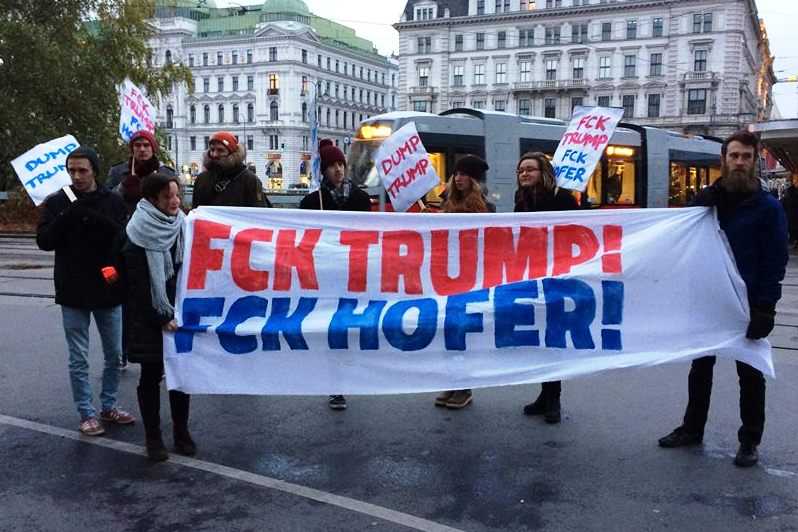 Ungefähr 25 Menschen aus Österreich, den USA und anderen Ländern trotzten am Samstag, 12. November den frostigen Temperaturen und versammelten sich am Schottentor vor der Universität in Wien zum Spontanprotest gegen Donald Trump und den FPÖ-Präsidentschaftskandidaten Norbert Hofer. Auf einer kurzen Auftaktkundgebung wurde zu „American Idiot“ von Green Day getanzt. Von dort marschierte der Demonstrationszug mit dem Banner „FCK Trump – FCK Hofer“ über die Währinger Straße zur US-Botschaft in der Boltzmanngasse.