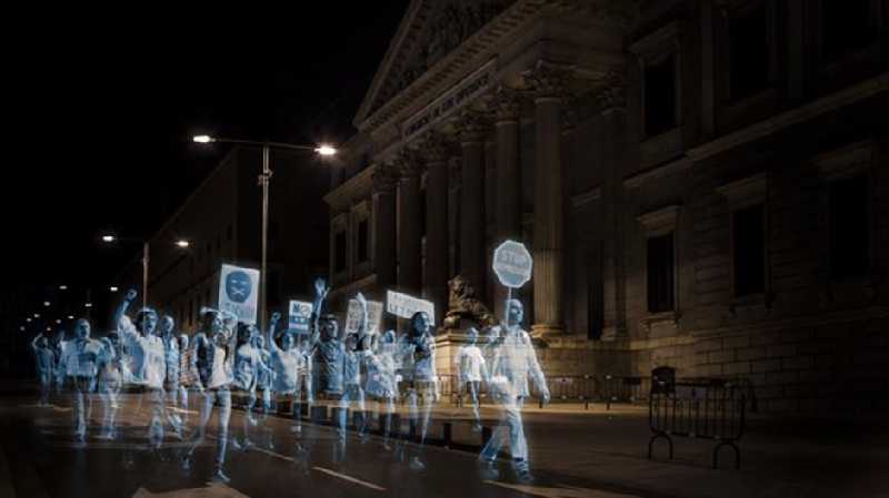 Am 12. April demonstrierten Tausende aus der ganzen Welt – virtuell mit ihren Hologrammen – vor dem Kongress in Madrid gegen ein neues Gesetz, das hohe Strafen auf legitimen Protest ausstellt.